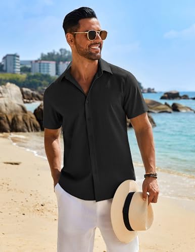 COOFANDY Mens Button Down Shirt Short Sleeve Casual Shirts Beach Summer Linen Shirts Wedding Vacation Shirt
