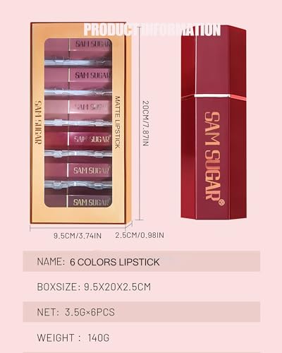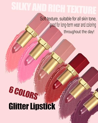6 Pcs Glitter Lipstick Brown Nude Pink Purple Red Sets, Matte Shimmer Light to Dark for Women Long Lasting 24 Hours Lip Gloss, Sparkling Shiny Waterproof Lip Stick Color Lip Stain labiales Makeup Gift
