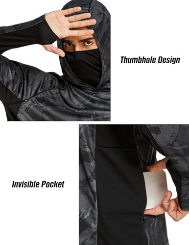 【Cooling Fabric】Our Long Sleeve Sun Protection Hooded Shirts are made of moisture-wicking fabric, the mesh panels at two sides enhanced ventilation, pulling moisture away rapidly from the skin and keeping you dry and comfortable all day. 【UPF 50+ Sun Protection】These Sun Protection Clothing gives you UPF protection to shield your skin and neck from harmful UVA/UVB rays. Our sun shirts block 99% more UV rays, keeping your sensitive skin safe in the summer. 【Thumbholes and Face Mask Design】This SPF Fishing Hoodie Shirt features thumbholes and a face mask cover. The thumb holes design keeps the sleeves in place and gives extra coverage for sun protection. The face mask keeps you away from dust and bugs. 【Hidden Zipper Pockets】The Camo Hooded Rash Guard Shirts have two big hidden side zipper pockets, which have enough capacity to put your personal belongings, such as your phone, wallet, etc. 【Occassions】This UPF 50+ Sun Protection Hoodie Shirt is lightweight, breathable, and stylish, it's perfect for summer outdoor activities, fishing, hiking, cycling, workout, camping, beach vacation, and daily wear, etc.
