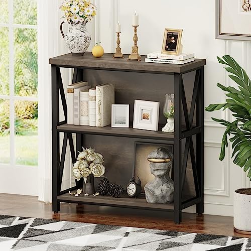 FATORRI Rustic Small 3 Shelf Bookshelf for Living Room, Industrial Low Wood Bookcase, Farmhouse Short Book Shelf for Small Space (Walnut Brown)