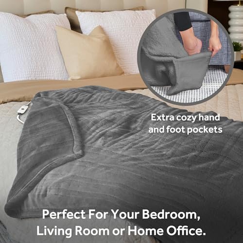 Sunbeam Royal Sherpa Foot Pocket Heated Throw Electric Blanket, 50" x 60", 4 Heat Settings, 4-Hour Auto Shut-Off, Warming Throw for Couch or Bed, Fast Heating, Machine Washable, Grey