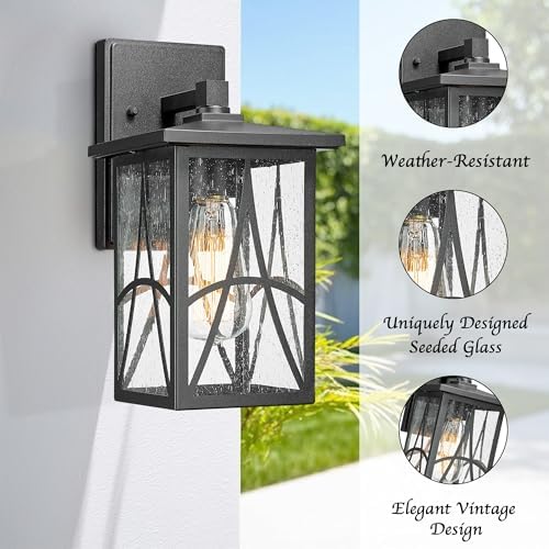 Bestshared Outdoor Wall Lantern with Seeded Glass \u2013 Waterproof Exterior Wall Light Fixture, Farmhouse Outside Sconce Lighting for Porch, Patio, Garage, Entryway (Black, 11.24 Inch Height)