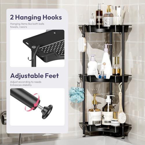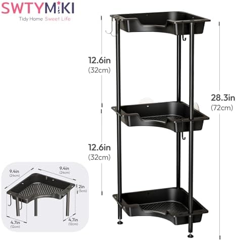 SWTYMIKI Corner Shower Caddy Standing - 3 Tier Rustproof Plastic Shower Caddy, Floor Corner Shelf, Free Standing Rack Storage Stands for Bathroom, Black