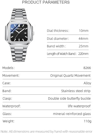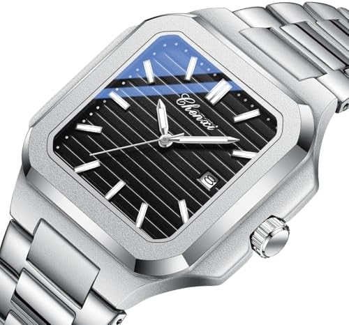 BESTKANG Men's Classic Square Watch - Silver Stainless Steel Analog Quartz Dress Watch with Luminous Hands, Date Calendar, 30M Water Resistant for Business Casual