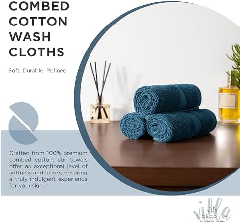 Villa Celestia 100% Cotton Wash Cloth for face & Body Set of 6, (12 x 12 inches) Sustainable, Soft, Highly Absorbent, Combed Cotton Wash Cloths Pack of 6 for Hotels, Spa, Bathroom, Dorm, Blue
