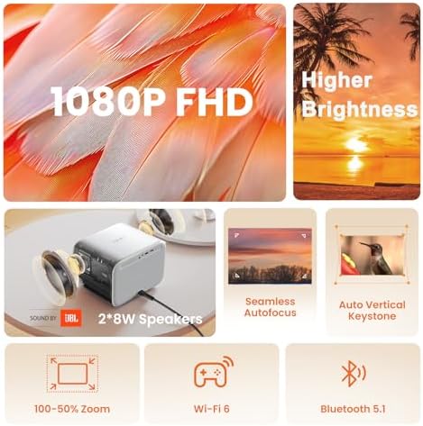 [Sound by JBL & Seamless Autofocus] Yaber 1080P Projector with WiFi 6 and Bluetooth, Portable Outdoor Movie Projector, Home Theater Projector for iPhone\/TV Stick\/HDMI\/USB\/Laptop\/PS5-White