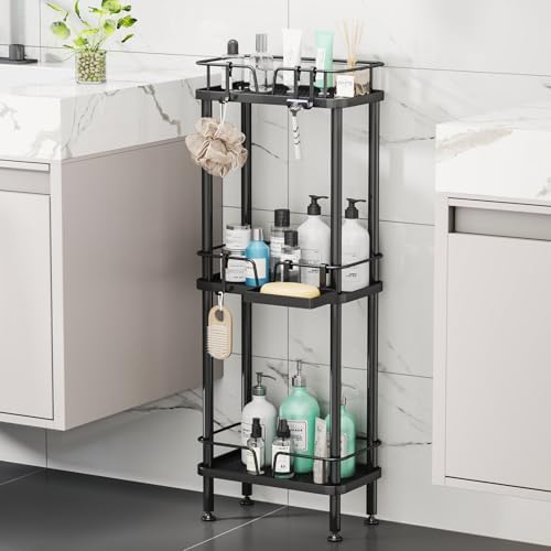 HapiRm Standing Corner Shower Caddy - 3 Tier Corner Shower Organizer with Soap Holder, Rustproof Stainless Steel Bathroom Shelf with 4 Hooks, Black