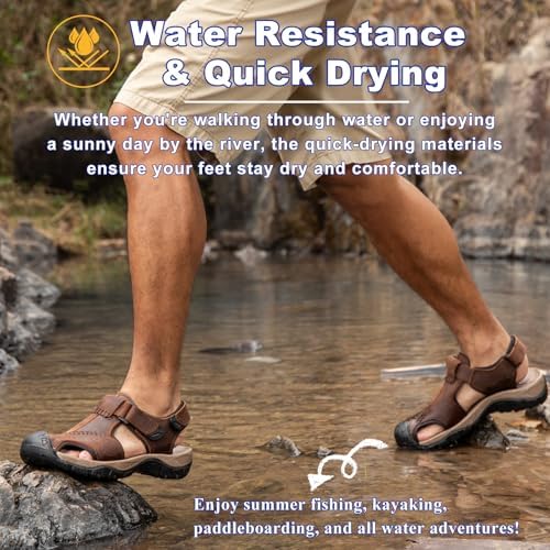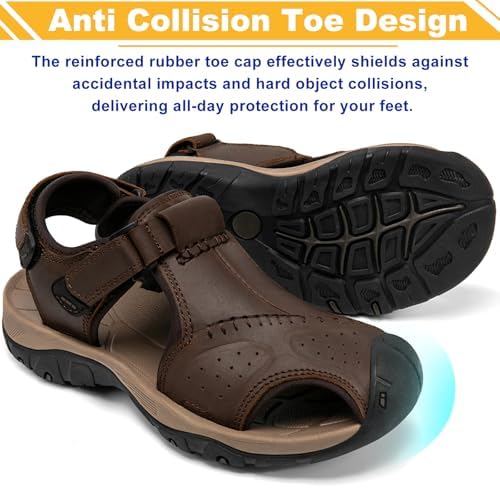 Boveshorn Men's Sport Sandals Closed Toe Leather Hiking Athletic Walking Outdoor Beach Trail River Fishing Water Shoes Lightweight Comfortable Waterproof