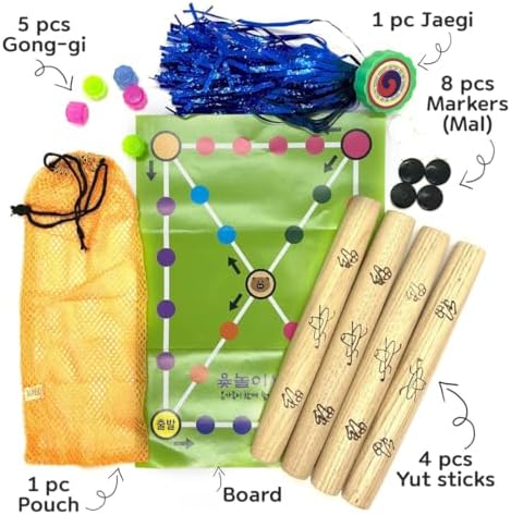 Korean Traditional Board Match Variety Set Yutnori (Yunnori 윷놀이) \/ Gonggi (공기) \/ Jaegi (제기) Folk Match for Family, Party, New Year