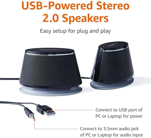 Amazon Basics Stereo 2.0 Speakers for PC or Laptop, 3.5mm Aux input, USB-Powered, 1 Pair, Black