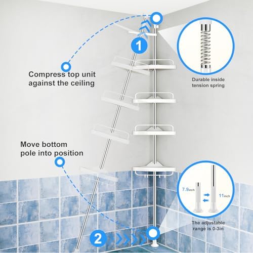 Corner shower rack, stainless steel shower rack tension rod, suitable for bathrooms, rust proof shower rack rod, with anti slip silicone pad, 4-layer adjustable rack and 8 hooks, height adjustable fro