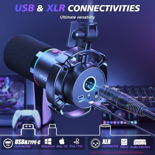 MAONO XLR\/USB Dynamic Microphone Kit, RGB Podcast Mic with Software, Mute, Gain Knob, Volume Control, Boom Arm for Streaming, Gaming, Voice-Over, Recording-PD200XS Black