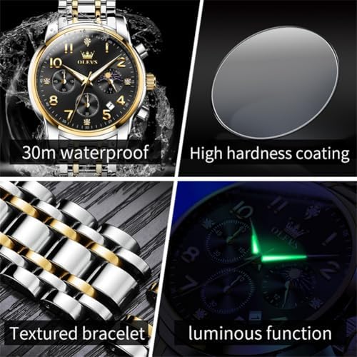 OLEVS Watch Men Luxury Classic Big Face Men's Wrist Watch Fancy Metal Stainless Steel Waterproof Mens Watches Everyday Easy Reader Date Moon Phase Analog Quartz Chronograph Watches Reloj para Homb