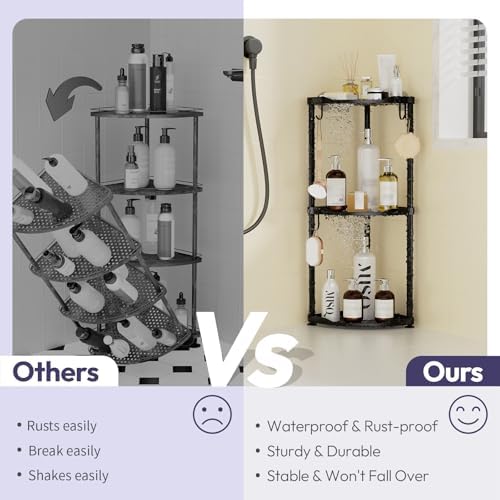 SWTYMIKI Corner Shower Caddy Standing - 3 Tier Stainless Steel Shower Organizer Stand, Large Capacity Floor Shelf with 4 Hooks, Rustproof Bathroom Storage Rack, Black
